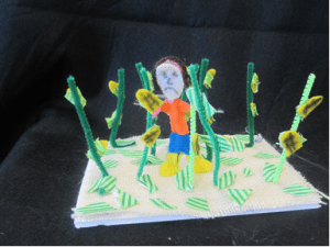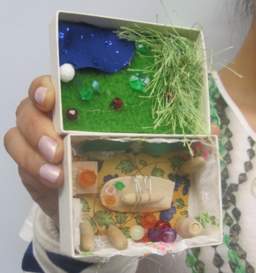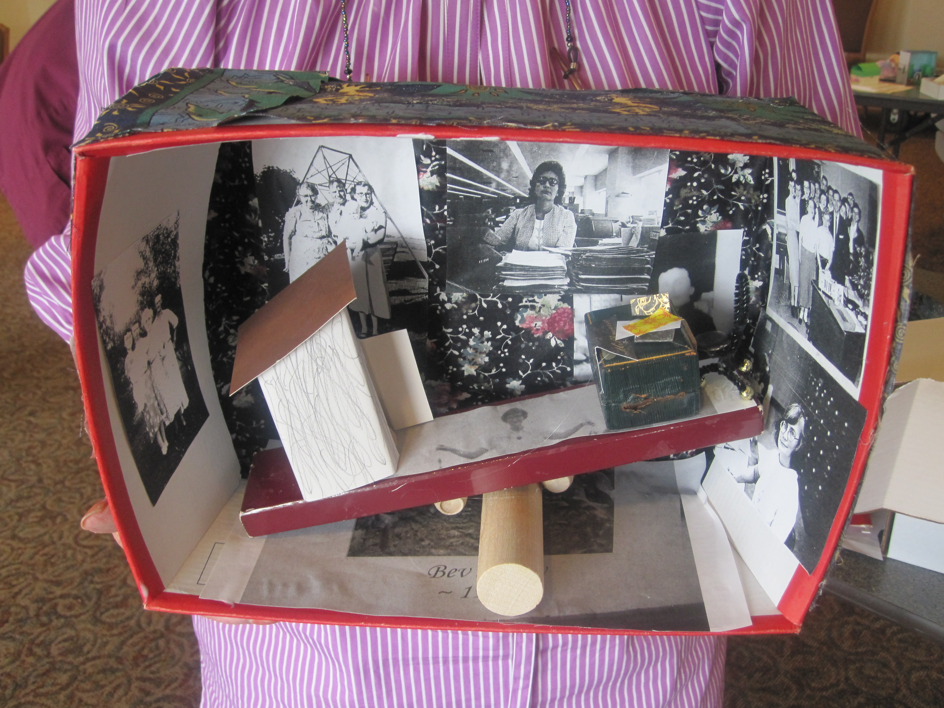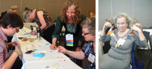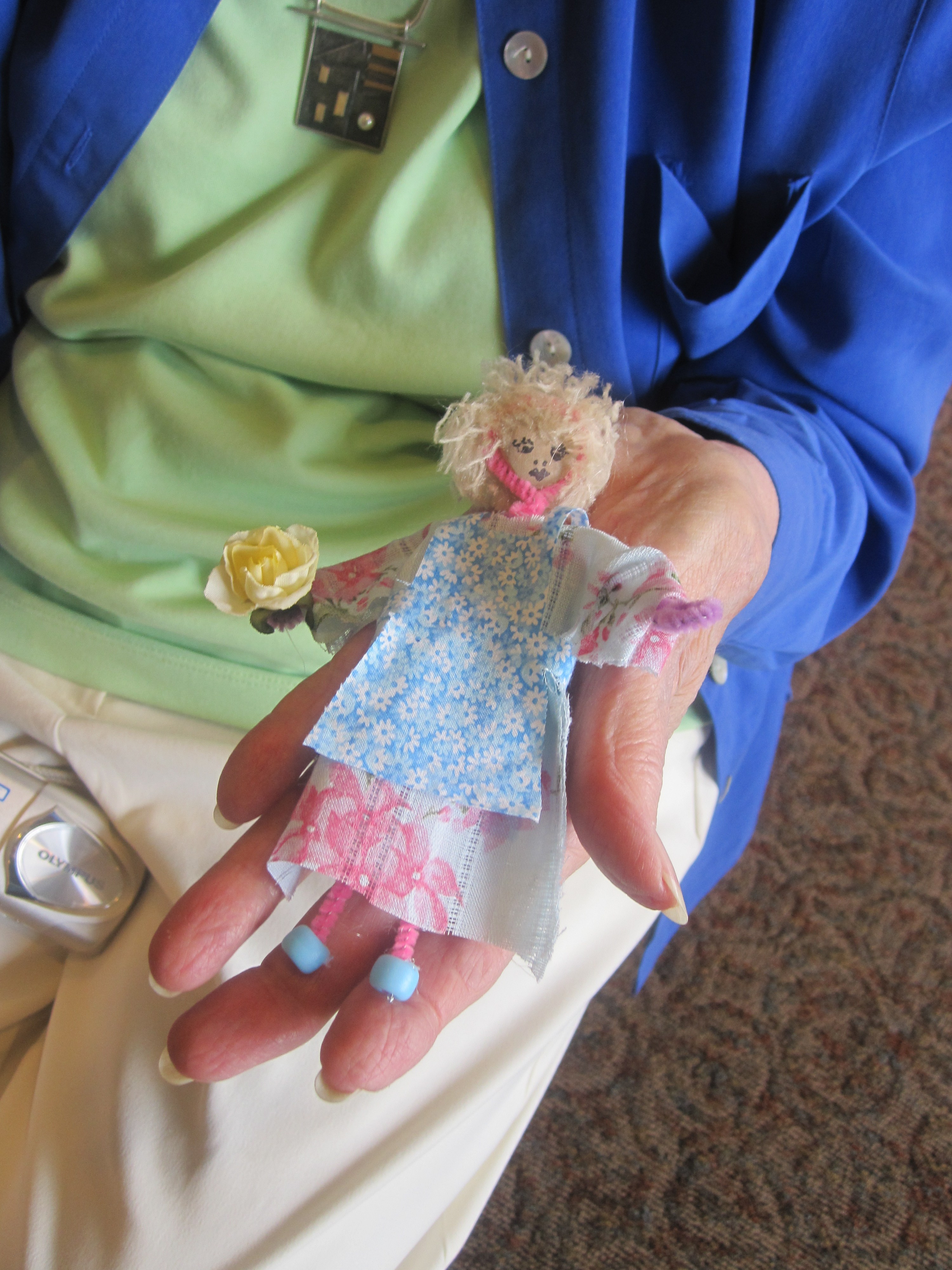 I gave some of my own examples, then we set to work. Wood bits, beads, wire, colored tissue, and hot glue – that’s all we used. But the results led to all kinds of stories. One woman made a tiny pony, remembering how she loved to ride them at the fair, though she never had a chance to ride anywhere else.